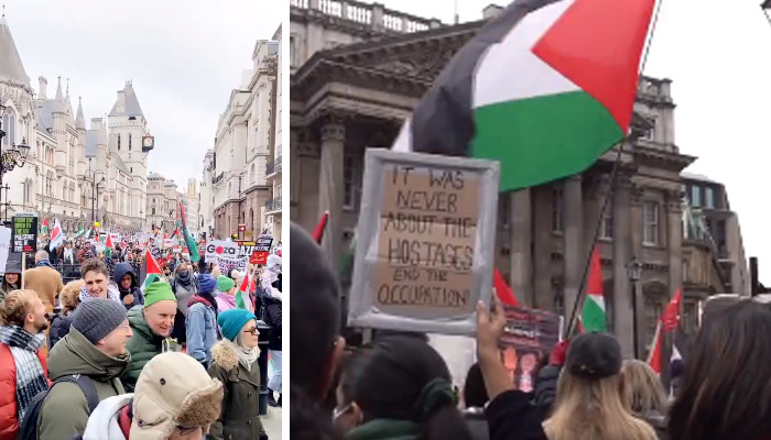 سینٹرل لندن میں ’اسٹاپ دی وار، فلسطین سالیڈیرٹی کمپین‘ کے زیر اہتمام احتجاج کیا گیا، جس میں شریک لاکھوں مظاہرین نے ’فری فری فلسطین‘ اور ’فوری جنگ بندی‘ کے نعرے بلند کیے۔