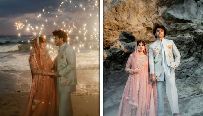 نکاح کے فوٹو شوٹ کے لیے جوڑے کو سمندر کنارے قدرت کے دلکش نظاروں کے درمیان مختلف پوز دیتے دیکھا جا سکتا ہے۔