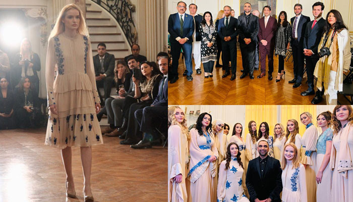 پیرس میں موجود پاکستانی سفارت خانے میں پاکستان کی دیہی خواتین کاریگروں اور کاروباری افراد کے اعزاز میں ایک فیشن شو کا انعقاد کیا گیا جس میں ماڈلز نے’ثقافت سے بھرپور ملبوسات‘ پہنے ریمپ پر واک کی۔