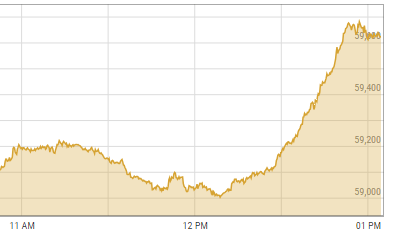 According to the PSX website, the KSE-100 index had recorded marginal gains until noon. However, at 1:11pm, it witnessed a sudden surge of 563.58 points, or 0.95 per cent, from the previous close of 59,086.35.