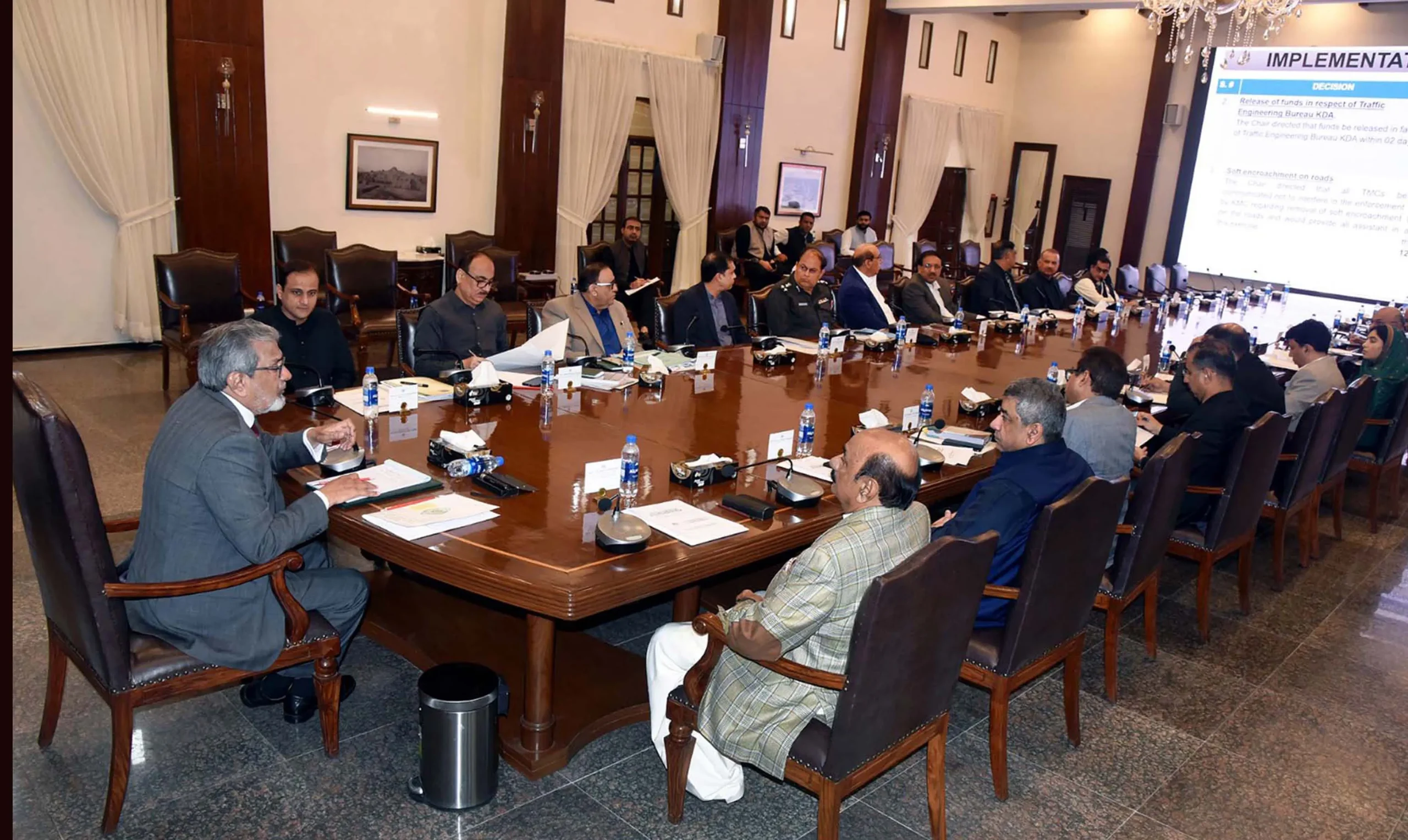 This is a very deplorable situation that we could not protect our main roads, streets and even parks, the CM said. Secretary Local government told the CM that he has written a letter to all the Towns of the city with the directives to assist and cooperate with KMC in the removal of encroachment from their respective towns. Chairman P&D Shakil Mangejo suggested that the Towns must be given funds to remove encroachment from their areas. He said that the Town administration have sent their budget proposals for the removal of encroachment. The CM directed the Secretary Local government to provide 30 per cent of funds to the demand of the Towns so that they could start the removal of encroachment, start tree plantation, and improve their roads, footpaths and sewerage systems. The CM directed the mayor KMC to develop pushcart markets. They should have a dedicated properly develop area. He directed Murtaza Wahab to submit his proposal. Traffic Engineering Bureau: The Chief Minister approved a Rs50 million one-time grant for the Traffic Engineering Bureau, KDA so that they start the upgradation of signals systems.
