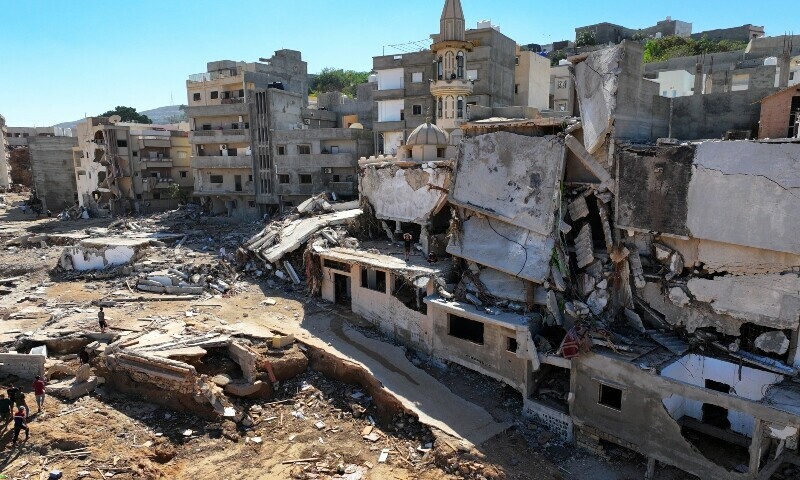 A torrent unleashed by a powerful storm burst dams on Sunday night and hurtled down a seasonal riverbed that bisects the eastern city of Derna, washing multi-storey buildings into the sea with sleeping families inside.