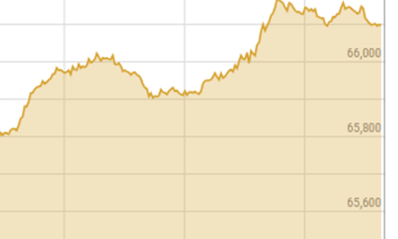According to the PSX website, the benchmark index made gains of 599.06 points at 11am to reach 66,049.24 — up by 0.92 per cent from the previous close of 65,450.18 points.