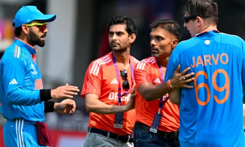 A pitch invader breached heavy security and fencing to break onto the field at the Cricket World Cup game between India and Australia on Sunday, getting to within touching distance of players including superstar Virat Kohli.