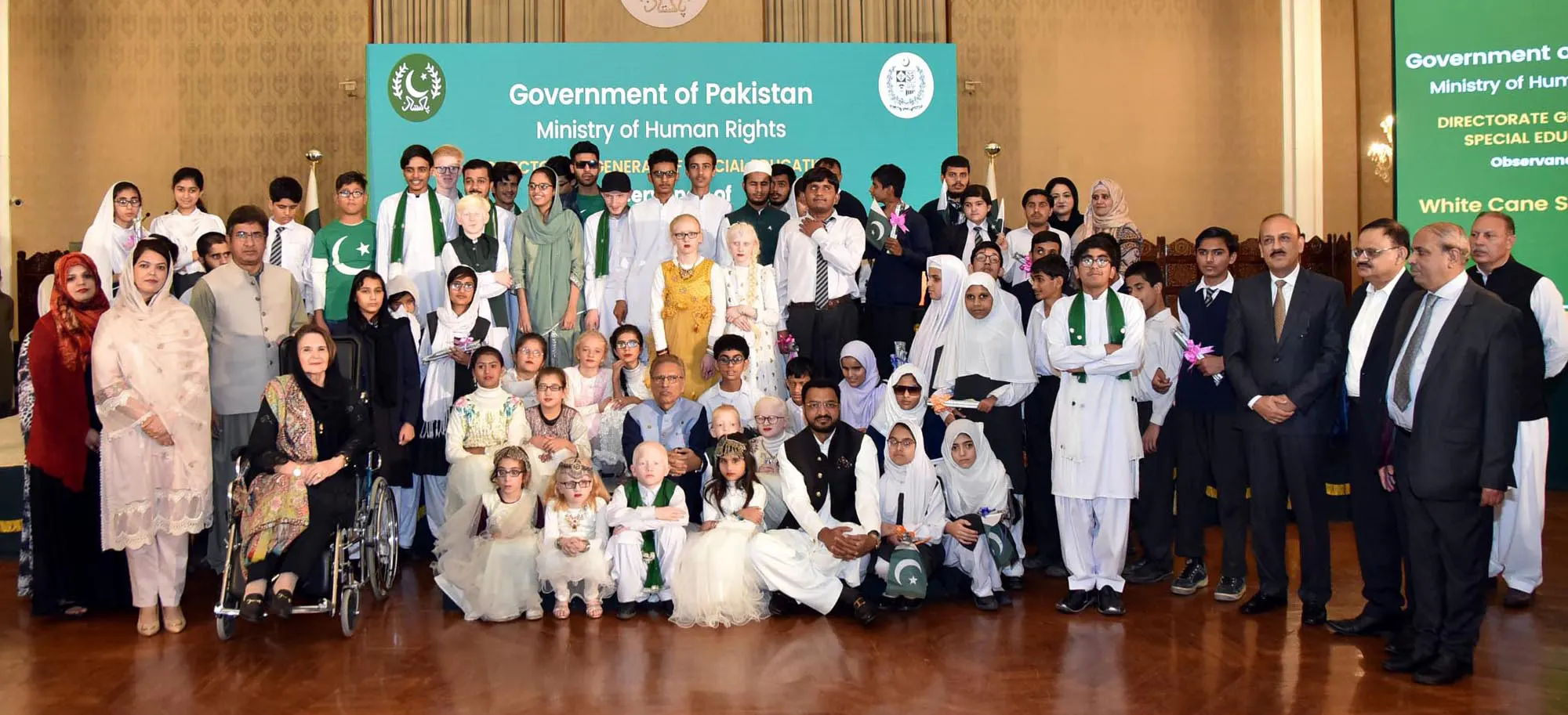 The president distributed white canes among the visually impaired children and later along with Begum Alvi had a group photograph with them.