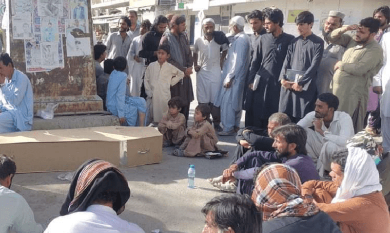 GWADAR: Family members and workers of different political parties joined members of civil society in a protest at the Fida Shaheed Chowk on Friday, along with the corpse of Balaach Mola Bakhsh, whose body was handed over to his family the other day.