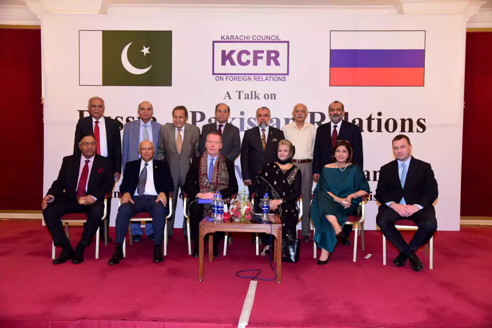The event was initiated with a welcome address by KCFR Chairperson Nadira Panjwani, who highlighted the historical background and the abundant resources of both countries, emphasizing that stronger ties would be mutually beneficial. Commodore Sadeed Malik conducted the session. Farooq Afzal elaborated on the economic and trade relations between the two countries, underscoring the significant gap between potential mutual economic activity and actual mutual economic activity. At the conclusion, the Chairperson presented the Ambassador with an Ajrak and a shield from KCFR.