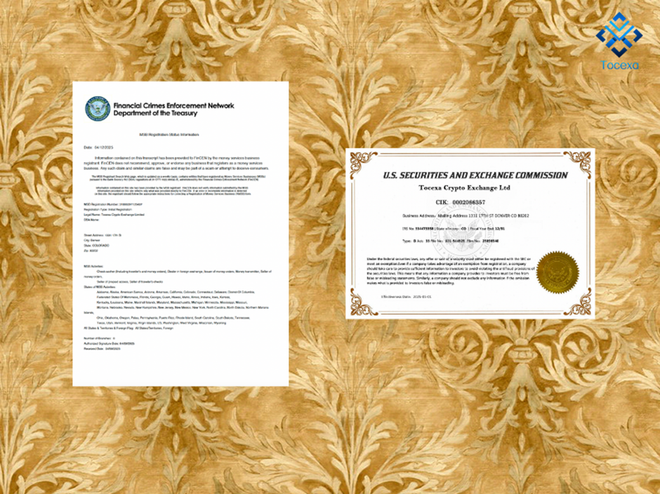 Tocexa’s SEC registration (CIK: 0002066357, File No: 021-544925) became effective on May 1, 2025, authorizing the platform to conduct regulated activities involving U.S. stocks, ETFs, tokenized securities, and compliant digital assets. Simultaneously, Tocexa obtained its MSB license (Registration Number: 31000297125437) with approval signed on April 9, 2025, empowering the company to offer fiat-to-crypto exchange, remittance, and money transmission services in all U.S. states and territories.